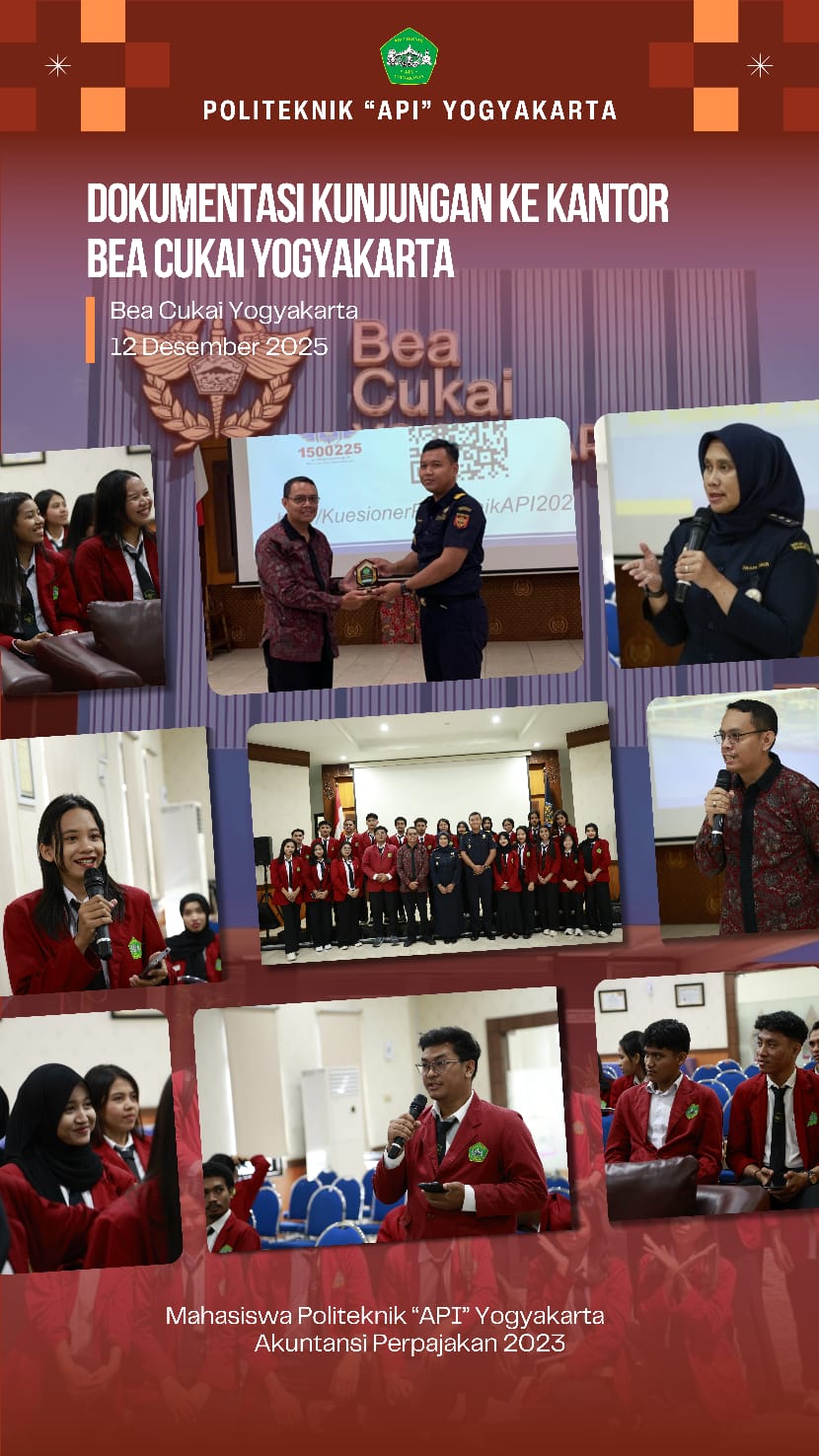 Pada hari Jumat, 12 Desember 2025, mahasiswa program Studi Sarjana Terapan Akuntansi Perpajakan dan Diplomah III Perpajakan Angkatan 2023 Politeknik “API” Yogyakarta , yang dipimpin oleh Erwin Budi Setyawan.M.M. selaku Dosen Pendamping, telah melaksanakan kunjungan kerja dalam bentuk studi banding ke Kantor Pengawasan dan Pelayanan Bea dan Cukai (KPPBC) Tipe Madya Pabean B Yogyakarta. Kunjungan ini merupakan salah satu program kerja pada Program Studi STr Akuntansi Perpajakan dan Diplomah Tiga Perpajakan yang bertujuan untuk memperoleh wawasan praktis dan mendalam mengenai, pelayanan, dan pengawasan kepabeanan serta cukai di Indonesia.